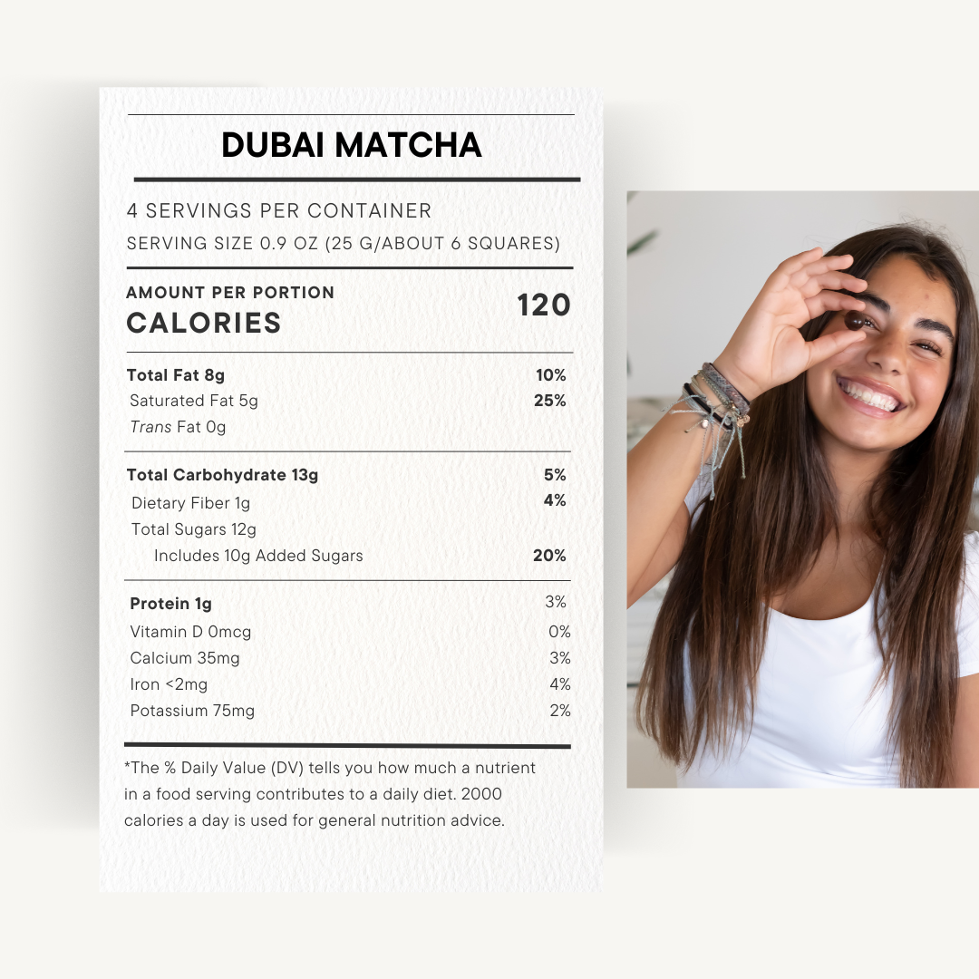 INGREDIENTS: White chocolate (60%) (sugar, cocoa butter, whole milk powder, emulsifier: soy lecithin; natural flavoring: vanilla), pistachio filling (40%) (sugar, vegetable fat (sunflower), pistachios (22.32%), skimmed milk powder, emulsifier: soy lecithin, kadayif (21.9%) (wheat flour (gluten), water), sesame paste (3.6%), matcha powder (2%). White chocolate cocoa solids: 28%.